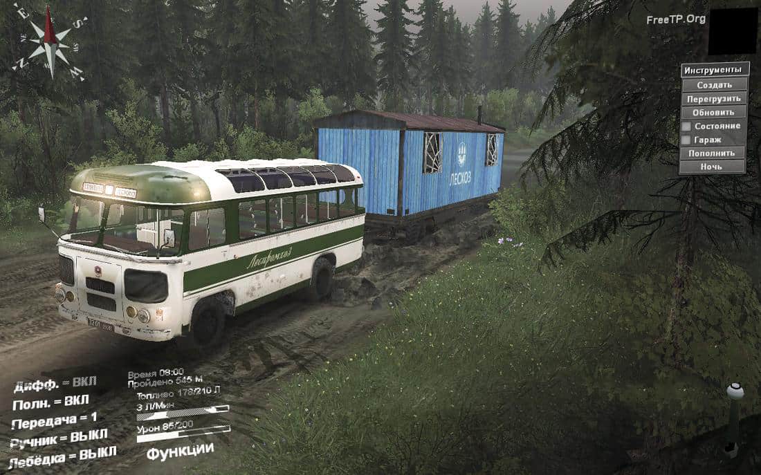 Logging trucks are busy. At the sawmill need extra. trailer. We cling to our bus, but first we go to a logging site (from there we need to deliver saws / lumber on the way to the sawmill). We load and go to the sawmill, unload and carefully attach the trailer, lower the ladder. In the next flight, our sawmill looks more attractive.